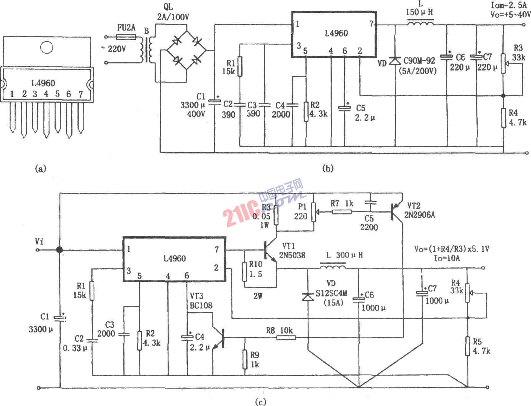 图(c)所示为L4960的电流扩展电路。该电路采用外接大功率三极管的方法。将输出电流扩展为10A。并且设置了由VT2、VT3以及R5、R6、R7、R8、R9等元件组成的过流保护电路,当输出电流大于10A时,保护电路动作,将L4960的⑥脚电位钳位到0V,关闭PWM比较器,终止电流的输出。