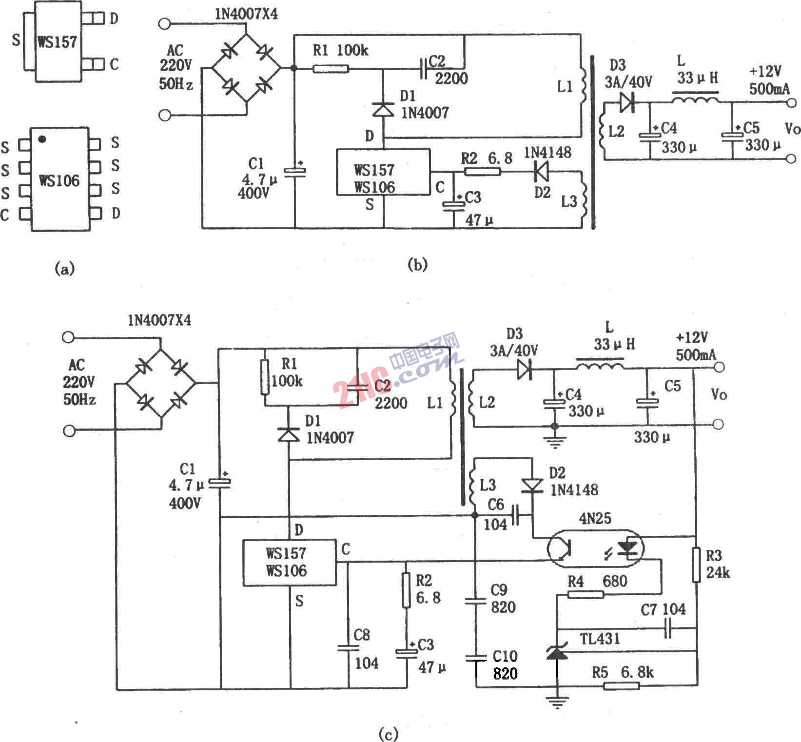 如图所示为用WS157或WS106小功率微型开关稳压电源。WS157或WS106是近年来新近开发的一种稳压式开关电源控制器件,内部将控制电路和功率开关管集成到同一个芯片上,具有PWM控制、过流过热等多种检测保护功能,外部仅需接合适的开关变压器和少量元件就能正常工作。用它制成的稳压电源特点是直接将交流市电(220V)转换成低压直流,且体积小巧,制作简单。WS157的功率为18W,WS106功率为12W。