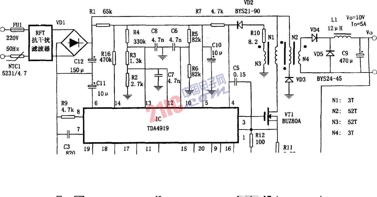 如图所示为由开关电源集成电路TD4919组成的开关稳压电源。该电源的交流输入电压为185~240V,直流输出电压为10V,输出电流为5A。其特点是具有对输出电压的过压、欠压监控功能和动态电流限制功能,因此工作安全可靠。