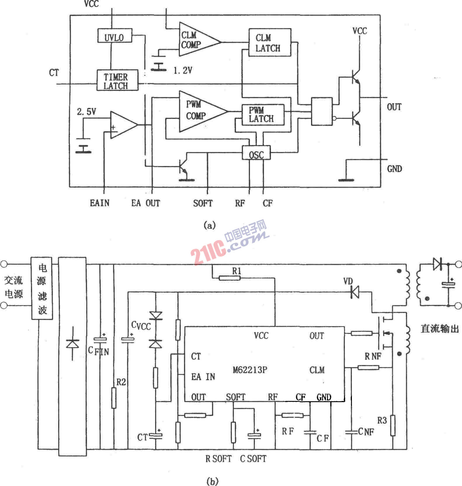 图(a)所示为M62213FP的内部结构框图。M62213FP是一种高速开关电源控制器。它由振荡器、PWM比较器、误差放大器、输出电路、过电压保护兼定时闭锁电路、过电流保护电路以及软启动电路等组成。开关工作频率为700kHz,输出电流峰值为±1A,采用推拉输出电路,启动前电路的电流很小,典型值为130μA,启动开始与停止时电压差较大,启动开始电压为12.5V,启动停止电压为8.3V,这样可减小输入平波电容。片内具有高速限流、过压兼定时闭锁、死区控制兼软启动、光电耦合器直接激励的反馈用误差放大器、防止低电压时输出误动作等功能电路。外接很少元件,就可构成功能较为完善的开关稳压电源。