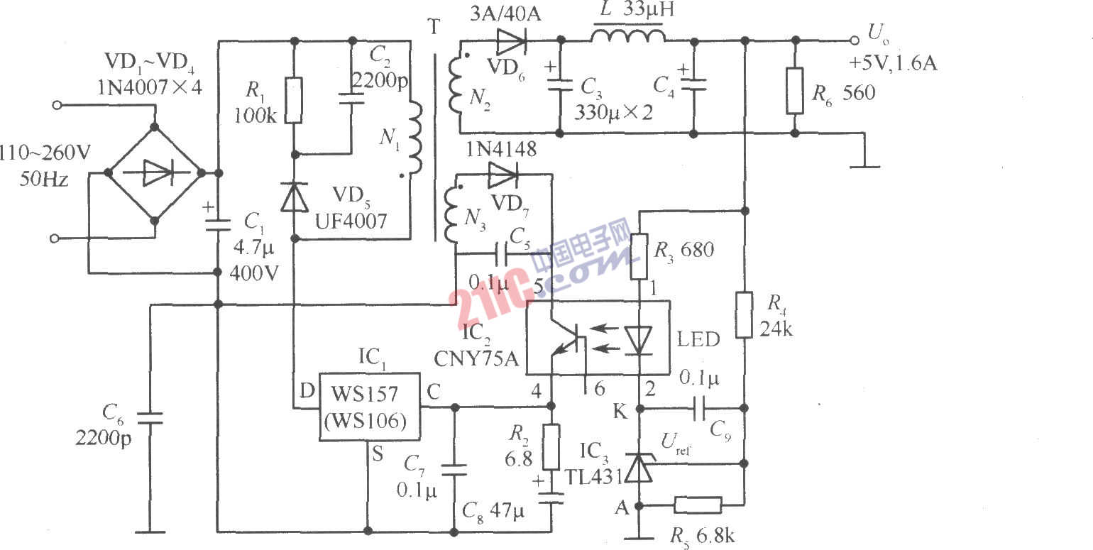 如图所示,该电路中增加了光耦合器(CNY75A)和可调式精密并联稳压器(TL431)。R3为限流电阻,R4和R5为取样电阻。当Uo变化时,取样电压就与TL431内部的2.5V基准电压进行比较,使K端电位发生变化,改变CNY75A中发射管(LED)的工作电流及发光强度,再经过光耦去调节WSl57的控制端电流,即可对占空比进行精细调节,实现精密稳压的目的。CNY75A还起到电气隔离作用。实测该开关电源的Sv<0.1%,SI=0.78%。
