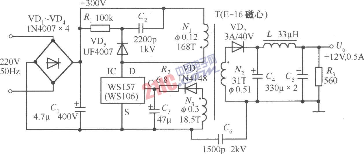 由WSl57构成的+12V、0.5A单片开关稳压电源电路如图所示。其输出功率为6W。当输入交流电压在110~260V范围内变化时,电压调整率Sv≤1%。当负载电流大幅度变化时,负载调整率SI=5%~7%。