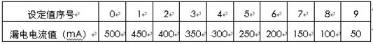11、漏电保护:漏电电流≥50mA时,动作时间0S,漏电电流值可根据用户需要按设定值序号自行设定,设定值序号对应的漏电电流值见表。(如需常开触点J2动作的在订货时注明,正常出厂常闭触点J动作)。