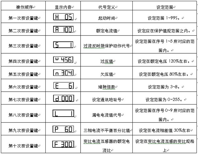 在电动机起动及运行时,按设置键无效。不起动电动机,保护器接通电源按设置键选择设定类型,此时设置指示灯亮,然后依次按移位键,选择数据移位,按数据键进行数据修改,某参数设定完毕,再按设置键,进入下一项设置状态,直至结束。所有参数设定完毕后,按复位键,退出设置状态,显示STOP。