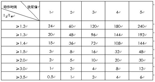 12、过流保护:躲过电动机启动时间自动投入,过流保护动作时间为反时限特性保护,保护动作时间可根据用户需要自行设定。设定值序号对应的电流倍数与保护动作时间特性见表。