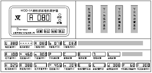保护器检测到电机故障时,LCD首位显示相应的故障代号,在发出跳闸信号前不停闪烁,动作后显示相应的故障类型及电机电流、电压值,故障指示灯亮。