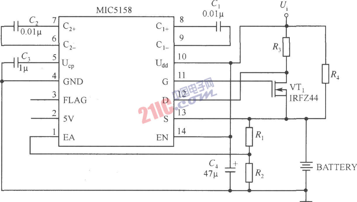 由MIC5158构成的恒流充电电路如图所示。该电路在整个充电过程中提供一个恒定的电流(35mV/R3),直到电池的电压充到:Uf1=1.235(1+R1/R2)式中,Ufl为浮充电压(V)。在达到浮充电压的条件时,MOSFET管就被关断,电荷电流就由R4来提供通路。