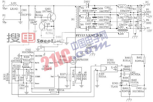 电源工作原理如下:电路采用单端正激变换电路,当变换器接通电源时,输入直流电压经由电阻、12V稳压管D601和三极管Q601、Q602组成的电路稳压降压后, 启动UC3843进入正常工作,偏置绕组L204的供电电路开始工作,输出经A4和C601整流及滤波后输出12V电压,高于自供电电压,使二极管A4反偏,启动电路停止工作。变换器进入正常工作后,电源依据PWM脉宽调制方式工作,次级绕组的输出经过二极管整流以及电容器和电感器组成的LC型滤波器滤波后,产生所需的各路输出直流电压。+5V的输出电压由电阻器R402和R406分压后,与可编程稳压源TL431(U3)中的2.5V参考电压比较,然后通过光耦合器U2反馈到UC3843的2脚,控制脉冲的占空比,稳定5V输出。耦合电感L202和L203实现+/-12V两路稳压。过流保护电阻R101、R102检测到开关管的过流信号,送入3843的3脚,封锁UC3843的输出信号,实现过流保护。