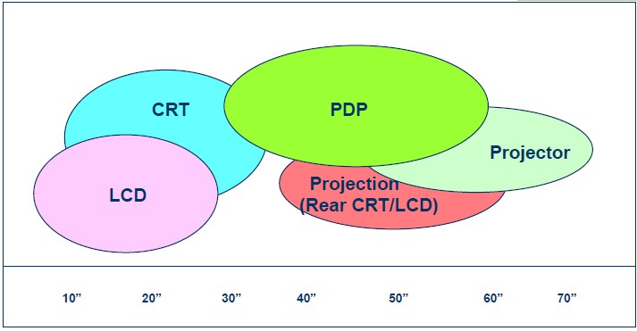 就生产方面而言,PDP的屏幕大小原则上是没有限制的,而CRT和LCD则在大尺寸的生产中存在许多困难。