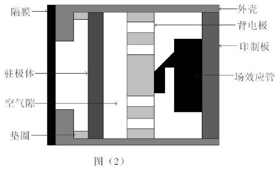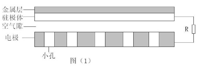 话筒的基本结构由一片单面涂有金属的驻极体薄膜与一个上面有若干小孔的金属电极(背称为背电极)构成。驻极体面与背电极相对,中间有一个极小的空气隙,形成一个以空气隙和驻极体作绝缘介质,以背电极和驻极体上的金属层作为两个电极构成一个平板电容器。电容的两极之间有输出电极。由于驻极体薄膜上分布有自由电荷。当声波引起驻极体薄膜振动而产生位移时;改变了电容两极版之间的距离,从而引起电容的容量发生变化,由于驻极体上的电荷数始终保持恒定,根据公式:Q =CU 所以当C变化时必然引起电容器两端电压U的变化,从而输出电信号,实现声-电的变换。实际上电容话筒的内部结构如图(2)。