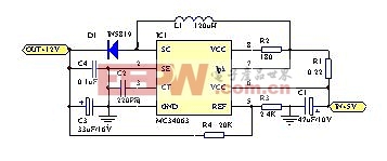 一般单片机编程器都需要5伏和12伏两种电源,12伏电源是Flash烧写用的。5伏电源可以直接从USB接口取得,12伏电源则可以用MC34063来制作,输入5伏,输出12伏。电路简单,无需调试,稳定性也好。我自制的编程器就用的这种方法,效果很好。电原理图如下: