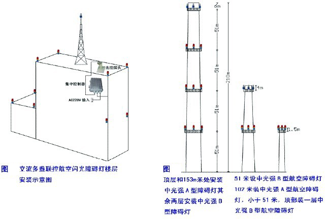 8·不弄那种航空闪光障碍灯,在其不同高度的航空障碍灯的数目及排列,应能从各个角度都能看到物体或物体群轮廓,并且应设置为同时闪烁或分层闪烁,以达到整体警示和景观效果。