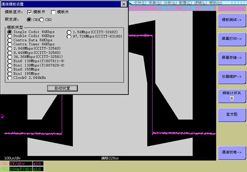 AV4481混合信号分析仪在模板功能菜单中可选择多种工业标准通讯脉冲模板,并可以进行自动设置。