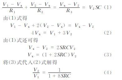 设输入为V1,运放输出为V2,电阻R1,R2 和R3交点的电位是Vx,电阻R2的阻值是R,R1和R3的阻值是2R,下面推导它的传输函数,根据运放的性质可得:
