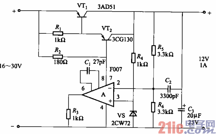 该电源所用元件不多,但具有良好的使用性能。当输入与输出电 故。该电源在输入电压为16—30V时,输出电压为12V,电流1A,内阻<0.0010,电压稳 定度为0. 05%,纹波电压峰值<25mV。 选择适当的分压电阻民、风或相应选择稳压管vs,稳压电源的输出电压能在大范围内变化。
