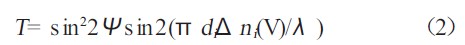 在液晶盒上、下各置一片偏振方向互相垂直的偏振片,当液晶盒上无电场时,蓝相液晶的表现如同一个各向同性介质,与上偏振片偏振方向相同的入射偏振光透不过液晶盒,呈现一个黑背景;当液晶盒上加有电场时,蓝相液晶的表现如同一个具有双折射特性的单轴晶体,其Δn 随外加电场的平方而增加,透过的光强度也随之增加,达到利用蓝相液晶的Kerr效应,用外电场实现调光的目的。这类器件透射率T与相位延迟的关系为: