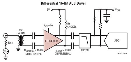 LTC6430-15 以简单易用为设计目标,所需的支持组件极少。该器件在内部匹配至 100Ω 差分源 / 负载阻抗。片内偏置和温度补偿功能可确保在环境条件变化的情况下提供一致的性能。