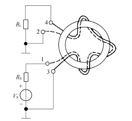 负载与传输线的特性阻抗相等时,即在负载匹配的条件下,两个线圈中通过的电流大小相等,方向相反(图2),在磁芯中产生的磁场正好相互抵消,因此磁芯中没有功率损耗,这对传输线工作方式极为有利。由于2、3 两端都接地,这样信号电压V1 加在传输线始端1、3 时,同时也加到线圈1、2 两端,负载则也接到线圈的3、4 端(图3),传输线变压器同时按变压器方式工作。由于电磁感应,负载也获得了与V1 大小相等的感应电压V2,不过V1 与V2 反相。此时,在1、3 和2、4 端的电压仍分别为V1 和V2,从而也保证了传输线工作方式的电压关系。