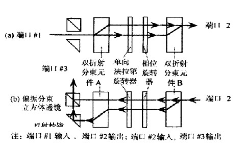 光环行器包括许多端口,一个非可逆旋转器,一个以至少一块双折射晶体形式存在的光束偏移器,一个偏振旋片,一个反射器。这些端口被准直到器件的一端,而反射器则被固定在另一端。第一和第二个透镜与反射镜一起在端口间提供有效的耦合。光束偏移器件在将所需要的其它光学元件的体积减小到最小的同时,其所提供的必要光束位移使光束连续端口进行转换。