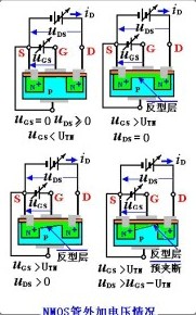 图2中衬底为P型半导体,在它的上面是一层SiO2薄膜、在SiO2薄膜上盖一层金属铝,如果在金属铝层和半导体之间加电压UGS,则金属铝与半导体之间产生一个垂直于半导体表面的电场,在这一电场作用下,P型硅表面的多数载流子-空穴受到排斥,使硅片表面产生一层缺乏载流子的薄层。同时在电场作用下,P型半导体中的少数载流子-电子被吸引到半导体的表面,并被空穴所俘获而形成负离子,组成不可移动的空间电荷层(称耗尽层又叫受主离子层)。UGS愈大,电场排斥硅表面层中的空穴愈多,则耗尽层愈宽,且UGS愈大,电场愈强;当UGS 增大到某一栅源电压值VT(叫临界电压或开启电压)时,则电场在排斥半导体表面层的多数载流子-空穴形成耗尽层之后,就会吸引少数载流子-电子,继而在表面层内形成电子的积累,从而使原来为空穴占多数的P型半导体表面形成了N型薄层。由于与P型衬底的导电类型相反,故称为反型层。在反型层下才是负离子组成的耗尽层。这一N型电子层,把原来被PN结高阻层隔开的源区和漏区连接起来,形成导电沟道。