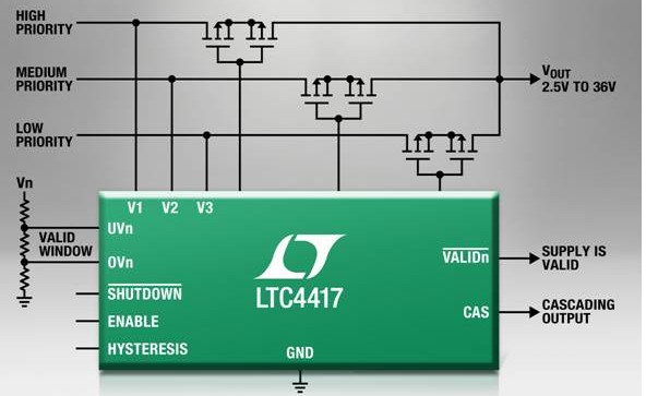 该器件适用于 2.5V 至 36V 系统。该控制器可从三个输入中选择优先级最高的有效电源来给负载供电。优先级由引脚分配来确定,当某个电源的电压连续处于一个由准确度为 1.5% 的欠压和过压门限设定的窗口之内达到 256ms 时,此电源就被定义为“有效”.LTC4417 极大地简化了设计,可从手持式和高可用性电子产品中常用的多种不同电压源获取供电。在此类系统中,优先级供电处理器是一种优于简单二极管“或”的解决方案,尤其是当优选电源的电压并非最高时。另外,LTC4417 控制器还可为负载提供至 -42V 的反向输入保护。