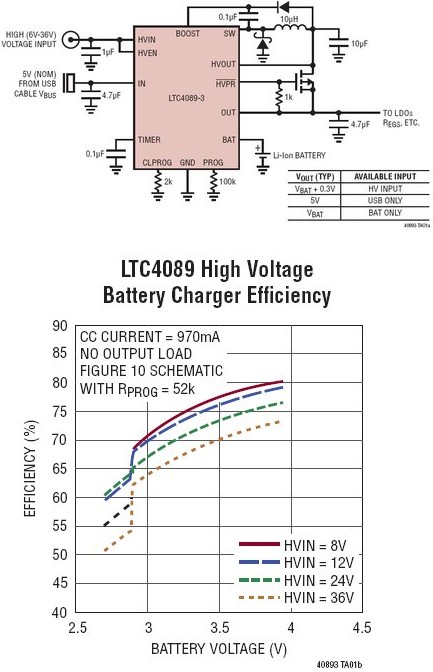 LTC4089-3 提供了一种可跟踪电池电压的自适应输出功能,用于在采用高电压输入时实现高效充电。标准 LTC4089 的这款 3.95V 版本适合那些具有扩展电池寿命要求或者需要进行高温 (大约 >60°C) 操作或存储的应用。在这些条件下,降低浮动电压将牺牲一定的初始电池容量,以增加整个电池寿命期间的容量保持率。充电电流是可设置的,而且,一个充电结束状态输出 (CHRG) 负责指示满充电状态。该器件还具有可设置总充电时间、一个用于在电池的充电和自动再充电过程中监视电池温度的 NTC 热敏电阻输入。