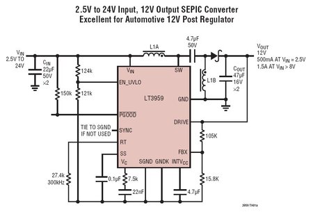 LT3959 在 -40°C 至 125°C 的温度范围内工作,采用 5mm x 6mm QFN-36 封装。千片批购价为每片 3.05 美元。