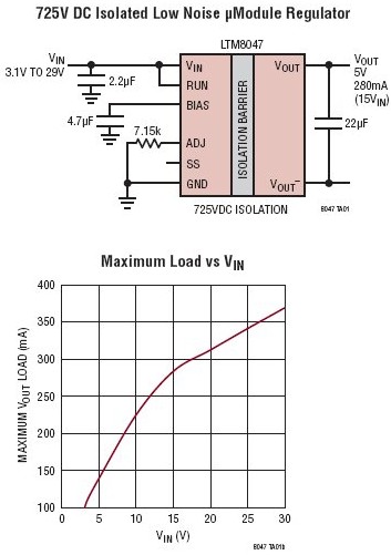 LTM8047 采用耐热性能增强型、紧凑 (11.25mm x 9mm x 4.92mm) 模压树脂球栅阵列 (BGA) 封装,包括变压器 ,控制电路和电源开关等所有元件均配置于这个小型封闭的 BGA封装中,为高振动应用提供卓越的互连可靠性。适合采用标准的表面贴装设备来进行自动化装配。LTM8047 符合 RoHS 标准。这些外形紧凑和可靠的产品在工业、航空电子及仪表设备中断开接地环路。