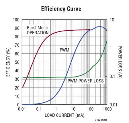 LTC3122 在停机模式中具有输出断接能力,从而大幅度地减少了输入电源消耗并使 VOUT 能完全放电。100kHz 至 3MHz 的可调 PWM 开关频率优化了应用,可实现最高的效率或最小的解决方案占板面积。对于那些对噪声敏感的应用,也可使振荡器同步至一个外部时钟。可选的突发模式操作将静态电流减小至 25μA,从而在整个负载范围内确保了高效率。内部软起动功能可限制启动期间的浪涌电流。