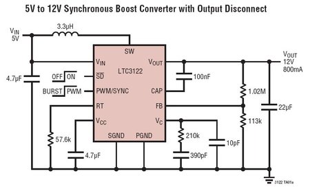 LTC3122 具有 RDS(ON) 仅为 121mΩ (N 沟道) 和 188mΩ (P 沟道) 的内部同步开关,以提供高达 95% 的效率。LTC3122 可通过一个外部引脚设定以在恒定 PWM 模式运行。其他特点包括外部同步、输出过压保护和坚固的短路保护。输出断接功能允许输出电压在停机时被完全放电,而且在启动时还消除了大的浪涌电流,从而最大限度地降低了输入电源的压力。当输入电压超过输出电压时,LTC3122 依然调节输出电压,从而使该器件能与任何电池化学组成兼容。就需要以尽可能最低噪声运行的应用而言, LTC3122 是一个需要高达 15V 输出的升压型应用之理想解决方案,在这类应用中,高效率、小的解决方案尺寸和高可靠性是决定性因素。