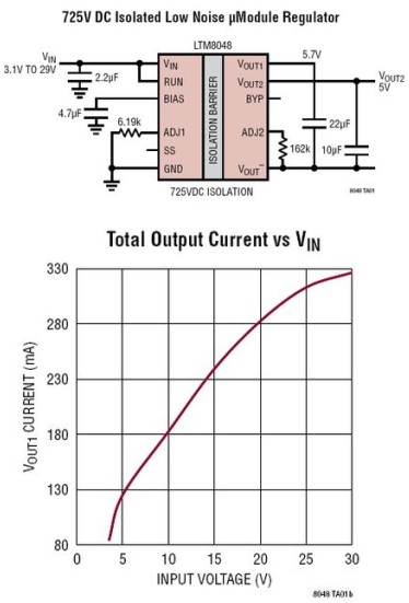 LTM8048 在副端提供稳定的输出电压,支持 2.5V 至 13V 的输出电压范围 (由单个电阻器来设定),可以在 3.1V 至 32V 的输入电压范围内运作。LTM8048包括一个低杂讯线性后稳压器,可在300mA时降低输出涟波杂讯至20μVrms.为了提高高准确度混合信号转换器的性能,LTM8048 的隔离式后置稳压器提供准确度为 2.5% 的输出电压。该 LDO 的噪声很低,可提供干净的电源轨。LTM8048 还提供过流保护和可调软启动的功能。