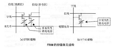 FRAM的存储单元主要由电容和场效应管构成,但这个电容不是一般的电容,在它的两个电极板中间沉淀了一层晶态的铁电晶体薄膜。前期的FRAM的每个存储单元使用2个场效应管和2个电容,称为“双管双容”(2T2C),每个存储单元包括数据位和各自的参考位。
