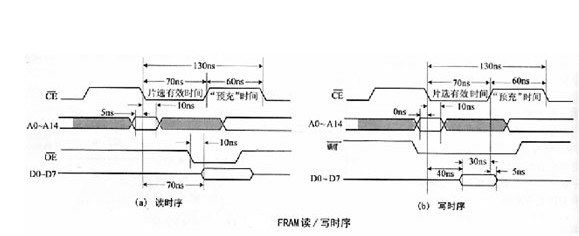 在FRAM读操作后必须有个“预充电”过程,来恢复数据位。增加预充电时间后,FRAM一个完整的读操作周期为130ns,图(a)所示。这是与SRAM和E2PROM不同的地方。图(b)为写时序。