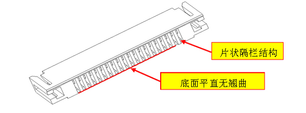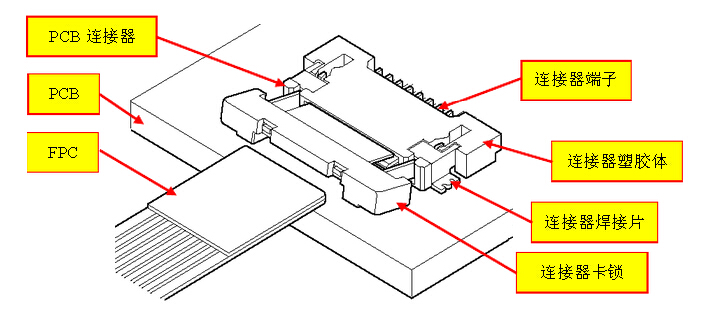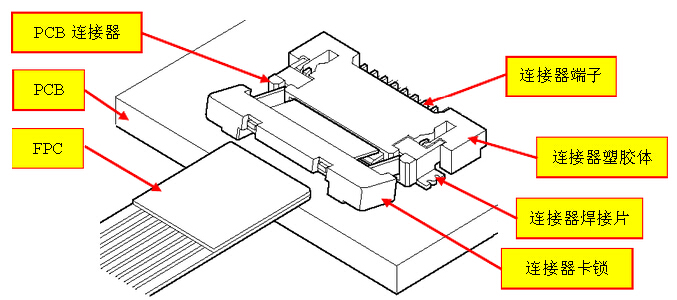 FPC连接器用于连接印制电路板(PCB)和柔性印制电路板(FPC),使之实现机械上和电气上的连接。其特点是一端与PCB焊接相连接(多采用SMT焊接),另一端与FPC对插,且FPC连接器上设计有卡锁装置使FPC和FPC连接器锁紧,保持一定的接触可靠性。故连接器的塑胶体和端子以及卡锁零件之间有严格的配合要求。如下图所示,是FPC连接器的产品示意图: