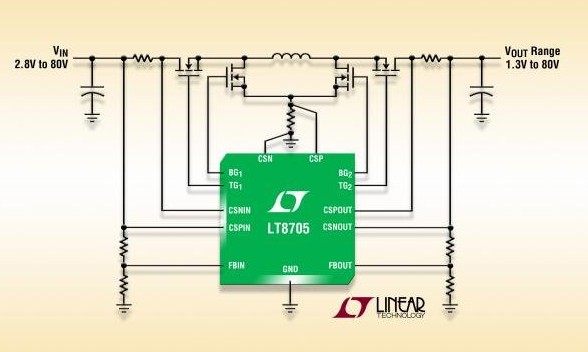 LT8705 在 2.8V 至 80V 的宽输入电压范围内工作,产生 1.3V 至 80V 输出,采用单个电感器和 4 开关同步整流。用单个器件可提供高达 250W 的输出功率。当多个电路并联时,可以实现更大的输出功率。工作频率可在 100kHz 至 400kHz 范围内选择,也可同步至一个外部时钟。LT8705 采用专有的电流模式控制架构,以降压或升压模式实现恒定频率工作,而且提供了 4 个强大的内置 N 沟道 MOSFET 栅极驱动器。用户可以选择强制连续、断续和突发模式 (Burst Mode?) 工作,以最大限度地提高轻负载时的效率。