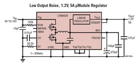 测试显示,当给一个模数转换器 (ADC) 供电时,与典型的降压型稳压器相比,LTM8028 可改善13dB 无寄生动态范围 (SFDR)。该Module 稳压器采用紧凑型 15mm x 15mm x 4.92mm BGA 封装,其整合了一个 36V 同步降压开关电源,用于为一个 5A 线性后置稳压器供电。