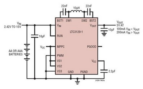 为了进一步减少组件数目并改善轻负载效率,LTC3129 内置了一个分压器以提供 8 种可选的固定输出电压。其他特点包括一个电源良好输出、小于 10nA 的停机电流以及热停机功能。