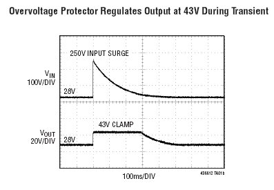 LTC4366-1 浪涌抑制器可保护负载免遭高压瞬变的损坏。通过控制一个外部 N 沟道 MOSFET 的栅极,LTC4366-1 可在过压瞬变过程中调节输出。在 MOSFET 两端承载过压的情况下,负载可以保持运作状态。在返回线路中布设一个电阻器可隔离 LTC4366,并允许其随电源向上浮动;因此,输出电压的上限仅取决于高值电阻器的可用性和 MOSFET 的额定规格。