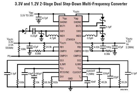分频使得能够调整每个通道的工作频率来优化总体性能及尺寸。通道1的运行频率可设置为通道2频率的1、1/2、1/4 或 1/8.图3示出了一个 3.3V/2.5A/550kHz通道和一个 1.2V/1A/2.2MHz 通道应用电路的布局。VOUT1相对较低的550kHz频率可将通道1的输入电压提升至36V,同时满足最小接通时间要求并保持高效率。VOUT2 的2.2MHz高频率则允许通道2使用较小的组件,如图3所示。尽管尺寸减小了,但电性能和热性能并没有任何下降。