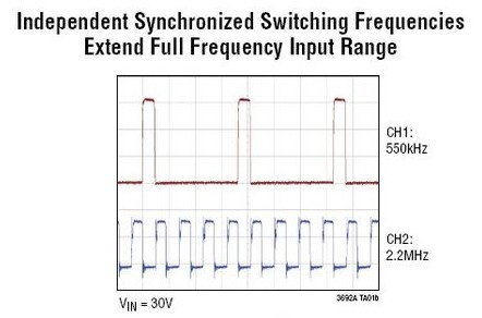 除了标准的0°和 180°外,独立同步还可在两个输出之间容许任何相差。LT3692A的相差通过控制同步信号的占空比来调节。