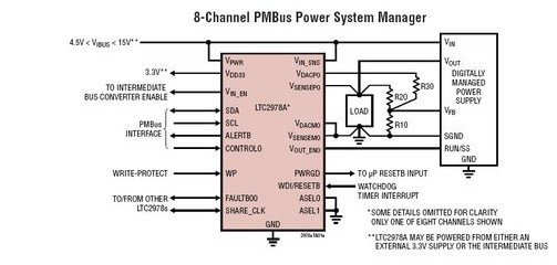 可编程故障响应能够利用“在检测到故障之后执行重试操作”的选项来停用电源。导致电源停用的故障会自动触发黑匣子 EEPROM 存储器记录故障状态及相关的远端采样。一个内部 16 位 ADC 负责监视 8 个输出电压、1 个输入电压和芯片温度。此外,奇数通道还可配置以测量一个电流检测电阻器两端的电压。