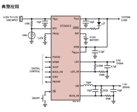 LTC3553-2在单节锂离子 / 锂聚合物电池应用上很广泛。该器件包括一个具自动负载优先级处理功能的 PowerPath 管理器、一个电池充电器、一个理想二极管和众多的内部保护功能。可以在使用电量耗尽电池的情况下实现“即时接通”操作。