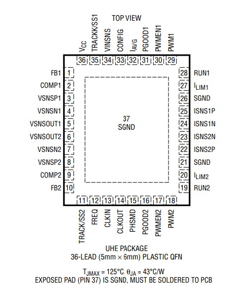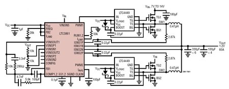 LTC3861是一款双输出同步降压型 DC/DC 控制器。该控制器运用了无损耗电感器 DCR 电流检测,以维持相位之间的电流平衡并提供过流保护。此芯片可在一个3V至5.5V的VCC电源范围内运作,并专为实现从3V ~ 24V的 VIN 至0.6V ~ (VCC - 0.5V)的输出电压的降压转换而设计。并且该控制器可与外部功率链器件(如Power Block和DrMOS)、以及分立式N沟道 MOSFET和相关的栅极驱动器配合工作,从而实现了灵活的设计配置。可并联多达12相和异相定时运作,以最大限度地减少输入和输出滤波,从而满足非常高的电流要求(高达300A)。
