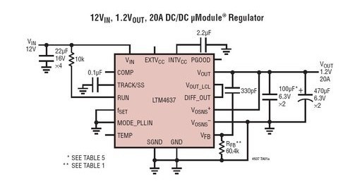电流模式操作实现了多达 4 个 LTM4637 稳压器的精准均流,以获得高达 80A 的输出。高开关频率和一种电流模式架构的运用提供了针对电压和负载变化的非常快之瞬态响应,而并未牺牲稳定性。该器件支持频率同步、多相 / 均流运作、突发模式操作以及用于电源轨排序的输出电压跟踪功能。可提供一个二极管连接的 PNP 晶体管,用作内部温度监视器。
