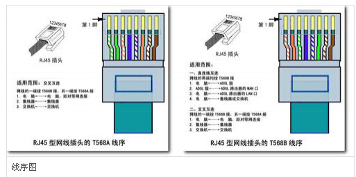两种国际标准并没有本质的区别,只是颜色上的区别,需要注意的是在连接两个RJ45水晶头时必须保证:1、2脚对是一个绕对,3、6脚对是一个绕对,4、5脚对是一个绕对,7、8脚对是一个绕对。在同一个综合布线系统工程中,只能采用一种连接标准。制作连接线、插座、配线架等一般较多地使用TIA/EIA-568-B标准,否则,应标注清楚。