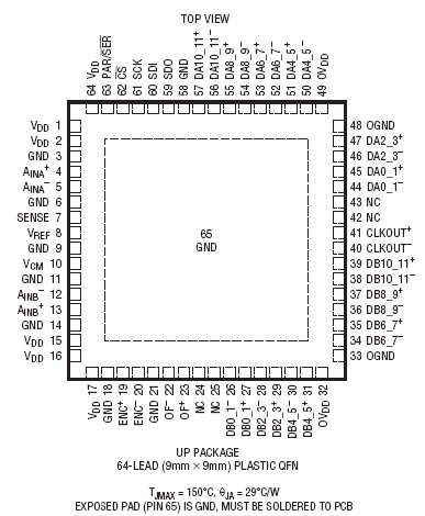 由LTC2158-12产生的热量被转移。从模头通过底侧暴露焊垫和封装引线到印刷电路板。为了获得良好的电气和热性能,必须外露焊垫、焊接到一个大的接地垫在PC板上。这焊垫应连接到内部接地平面导通孔的阵列。