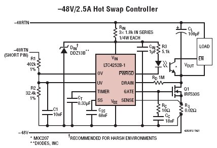 LTC4252C-1主要应用范围包括:带电电路板插入、电子电路断路器、-48V分布式电源系统、负电源控制、中心局交换、高可用性服务器以及ATCA(高级电信计算架构)领域中。主要的应用图如下: