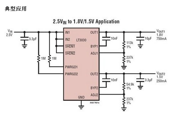 LT3030 可用非常小和低成本陶瓷输出电容器工作,从而优化了稳定性和瞬态响应。该器件在 750mA 通道用仅为 10?F 的陶瓷输出电容器就可稳定,在 250mA 通道则用 3.3?F 的陶瓷输出电容器即可。内部保护电路的功能包括电池反向保护、从输出到输入无反向电流、具折返的电流限制以及热停机。如果两个通道中的任一个出现过载或故障情况,那么热停机电路保护两个通道。