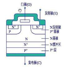 左边所示为一个N沟道增强型绝缘栅双极晶体管结构, N+区称为源区,附于其上的电极称为源极(即发射极E)。N基极称为漏区。器件的控制区为栅区,附于其上的电极称为栅极(即门极G)。沟道在紧靠栅区边界形成。在C、E两极之间的P型区(包括P+和P-区)(沟道在该区域形成),称为亚沟道区(Subchannel region)。而在漏区另一侧的P+区称为漏注入区(Drain injector),它是IGBT特有的功能区,与漏区和亚沟道区一起形成PNP双极晶体管,起发射极的作用,向漏极注入空穴,进行导电调制,以降低器件的通态电压。附于漏注入区上的电极称为漏极(即集电极C)。