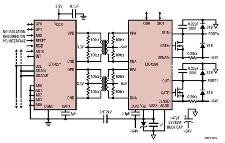 用户将非常欢迎 80V 端口引脚所提供的坚固性和业界最低的功耗,与采用更易损坏和 RDS(ON) 通常较高的 MOSFET 进行设计相比,使用 LTC4290时的热设计要容易得多。PD 发现是用一种专有的双模式、4 点检测机制来完成,该机制确保了最佳的抗 PD 误检测能力。先进的电源管理包括排定优先级的快速停机、每端口 12 位电压及电流回读、8 位可编程电流限制和 7 位可编程过载电流限制、以及现场可升级的固件。1MHz I2C 接口允许主控制器以数字方式配置该 IC 或查询端口读数。“C”语言库还可用来降低 NRE 并加速产品上市。